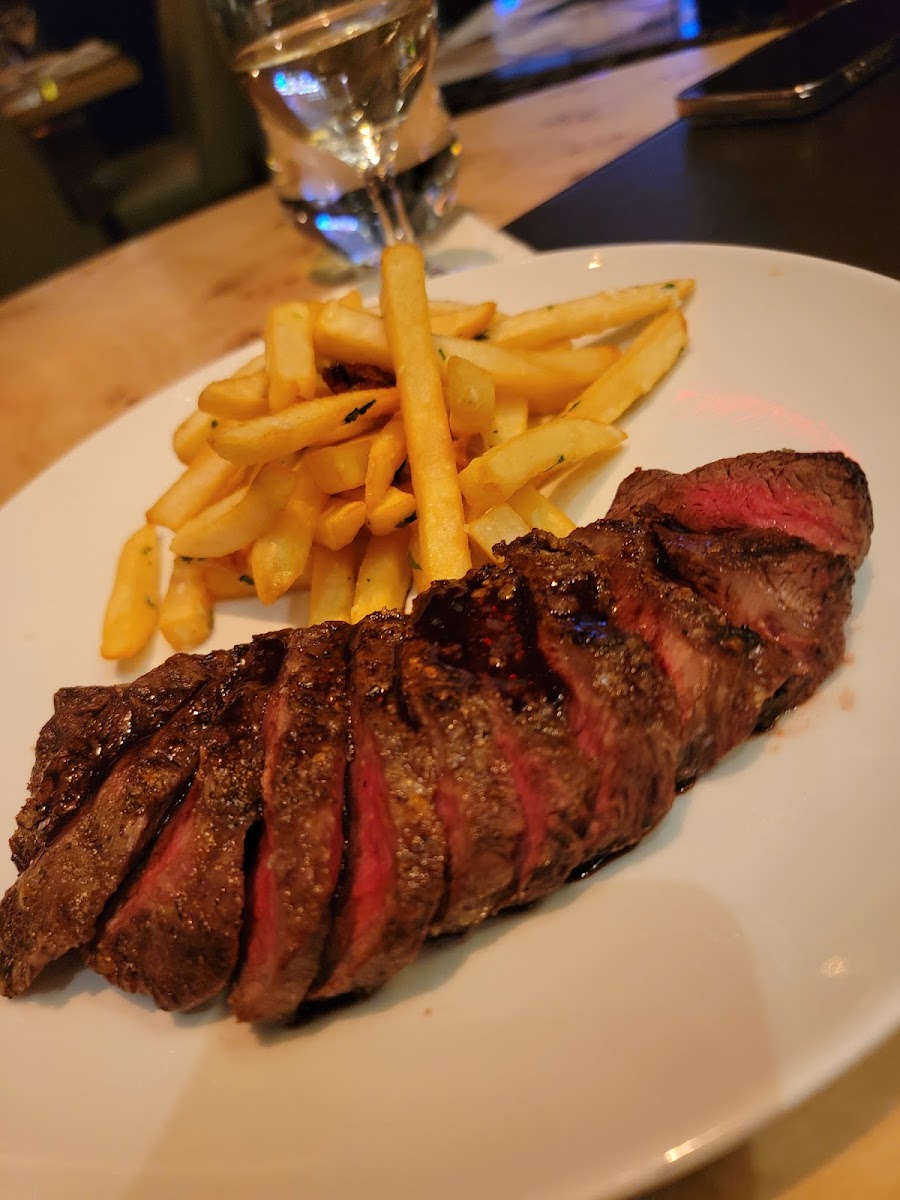 Spur of the moment dining adventure because the Asian restaurant was closed. Glad they were (I've dined there before) and William B's Steakhouse was so much better. I know you can't compare. Special shout out to Roger (hope that was his name) from Kauai who was our server. He was very personable and he chatted with us a bit too which made our dining experience a great one. Mahalo Roger for your genuine service. As Maile and I said, we will return. Food: Crab Cakes Steak Frites Banana Cream Pie (Huge) Bread Service The crab cakes were delicious. However, something needed to wake the dish up and luckily Roger was great to bring us sauces. He brought like an aioli and a vinegarette sauce and I preferred the vinegarette. The acidic taste / flavor woke that crab cake dish up. The steak on the other hand was flavorful and seasoned well. Tender and tasty. Really good. Lastly, that Banana Cream pie is a MUST!!! Overall, a great experience. We will return with our other half and dress more appropriately. Lol. P.S. They would have gotten a 5 Star if that crab cake was not so dry.