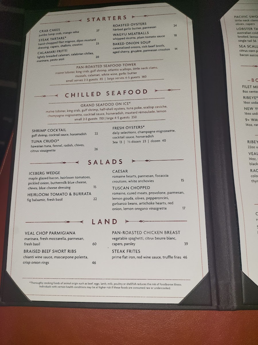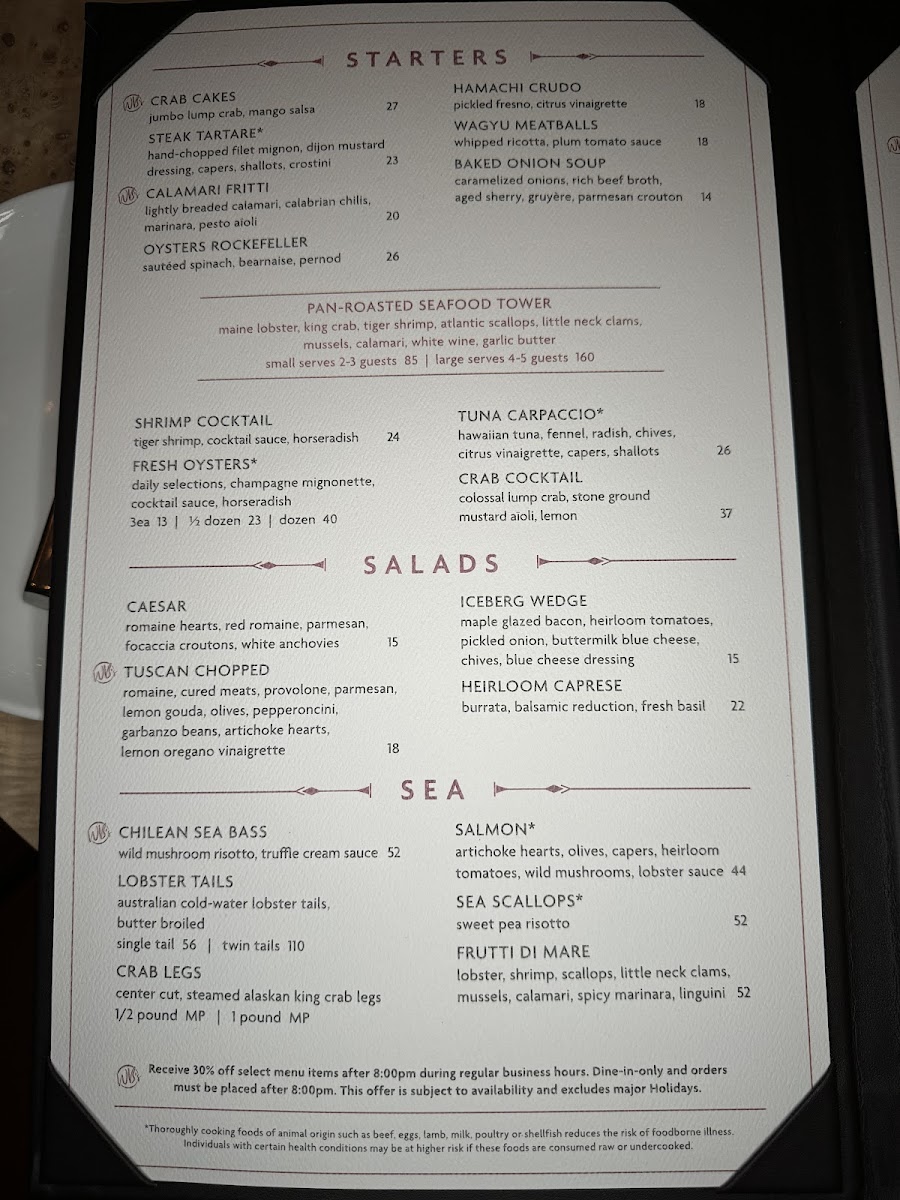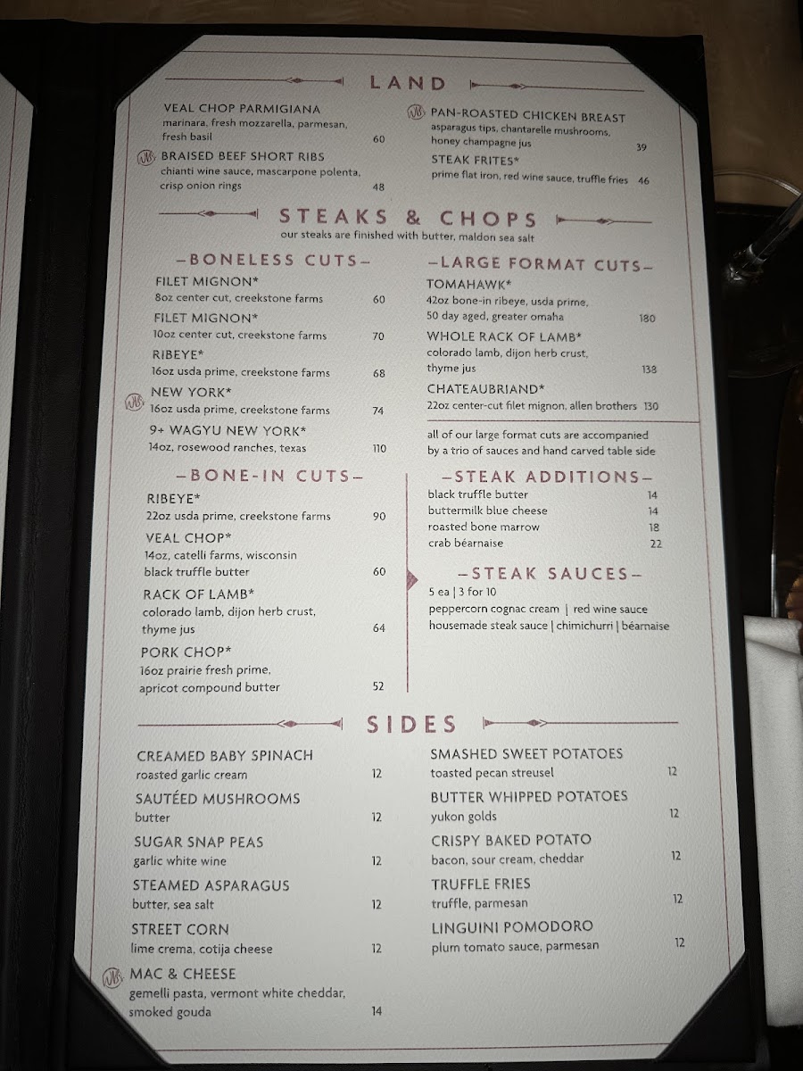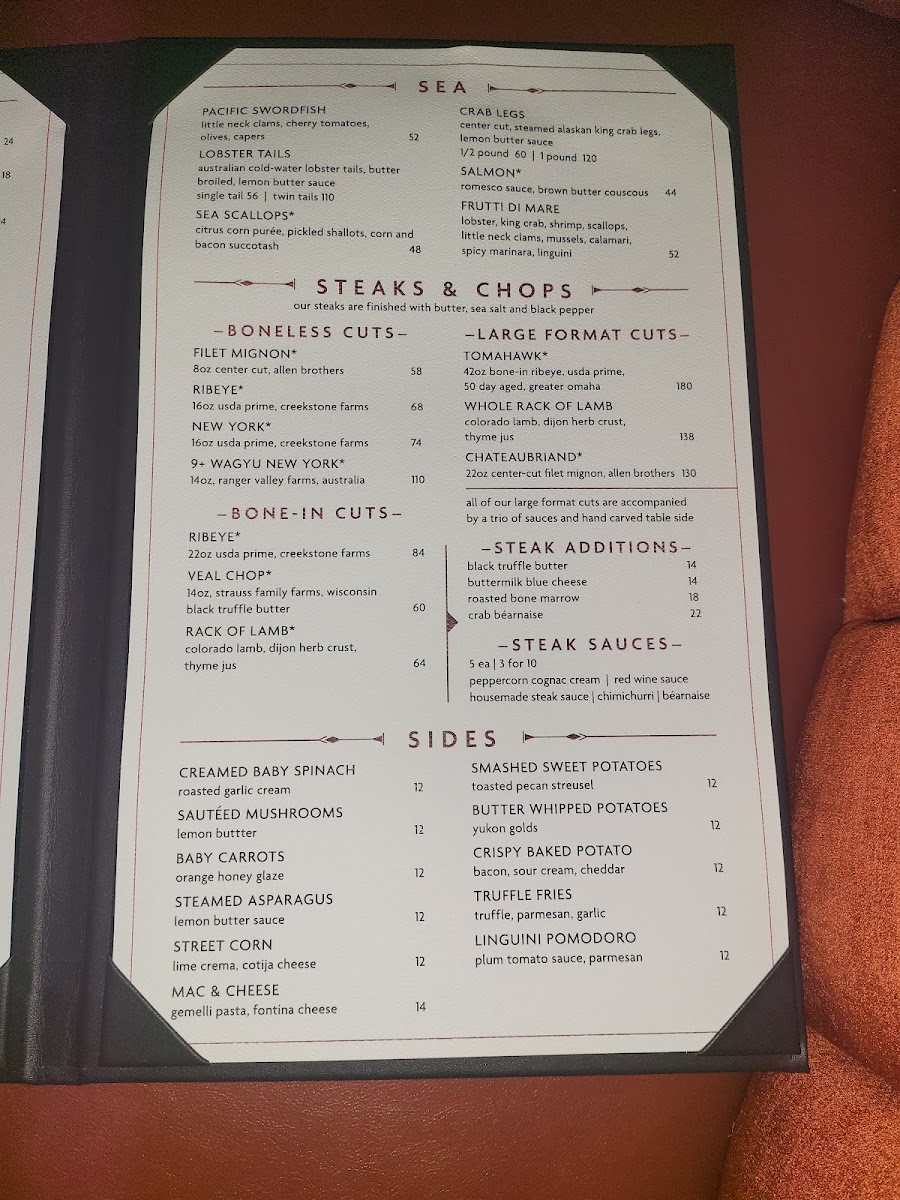 - Steakhouse favorites including tomahawk and ribeye steaks